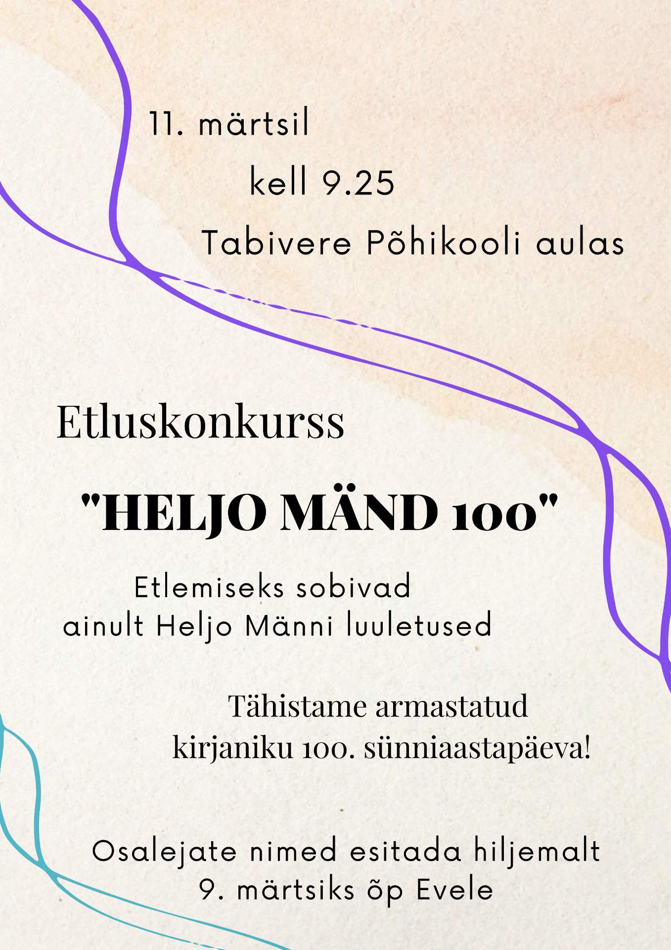 11. märtsil kell 9.25 toimub etluskonkurss, millega tähistame kirjanik Heljo Männi 100. sünniaastapäeva.
