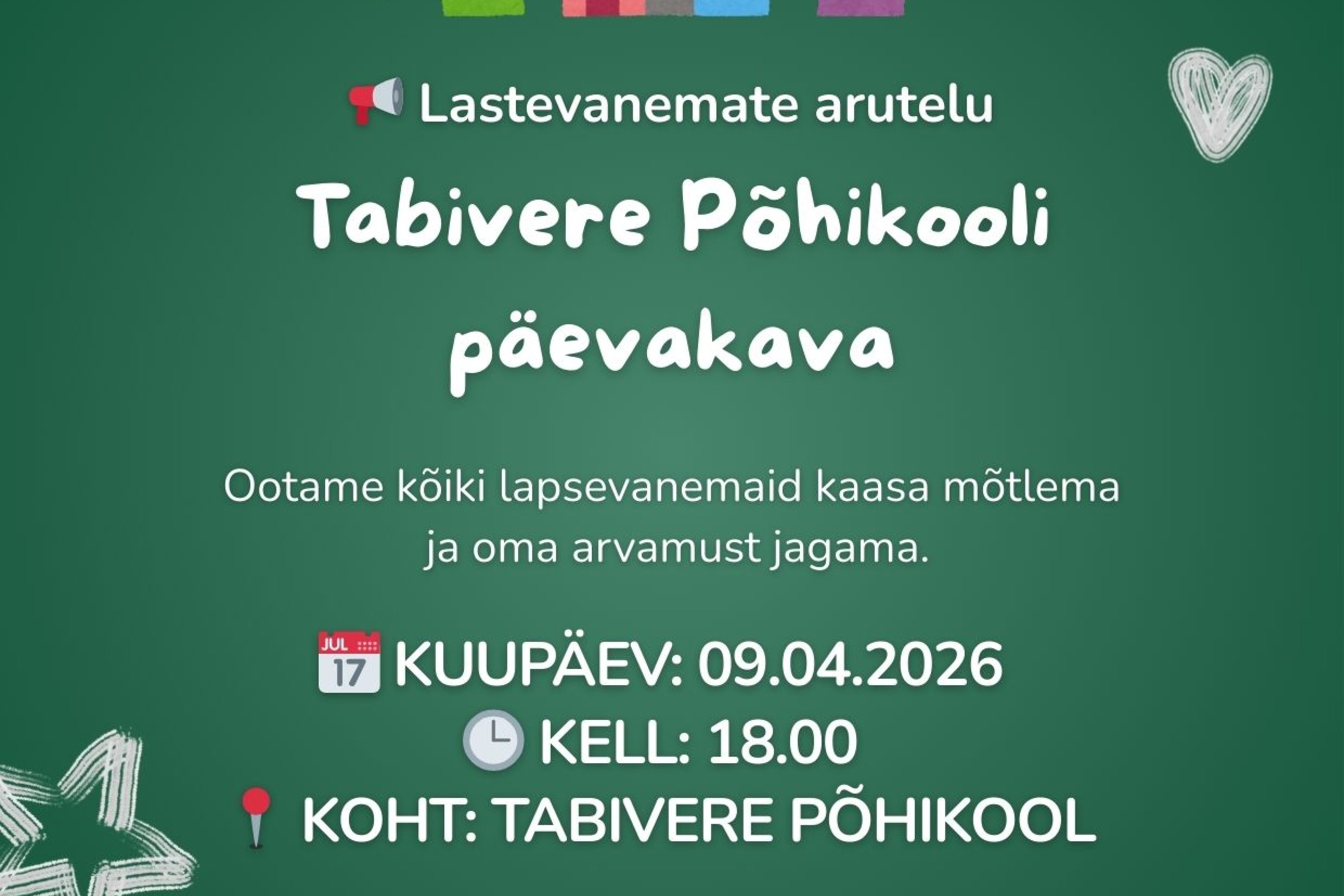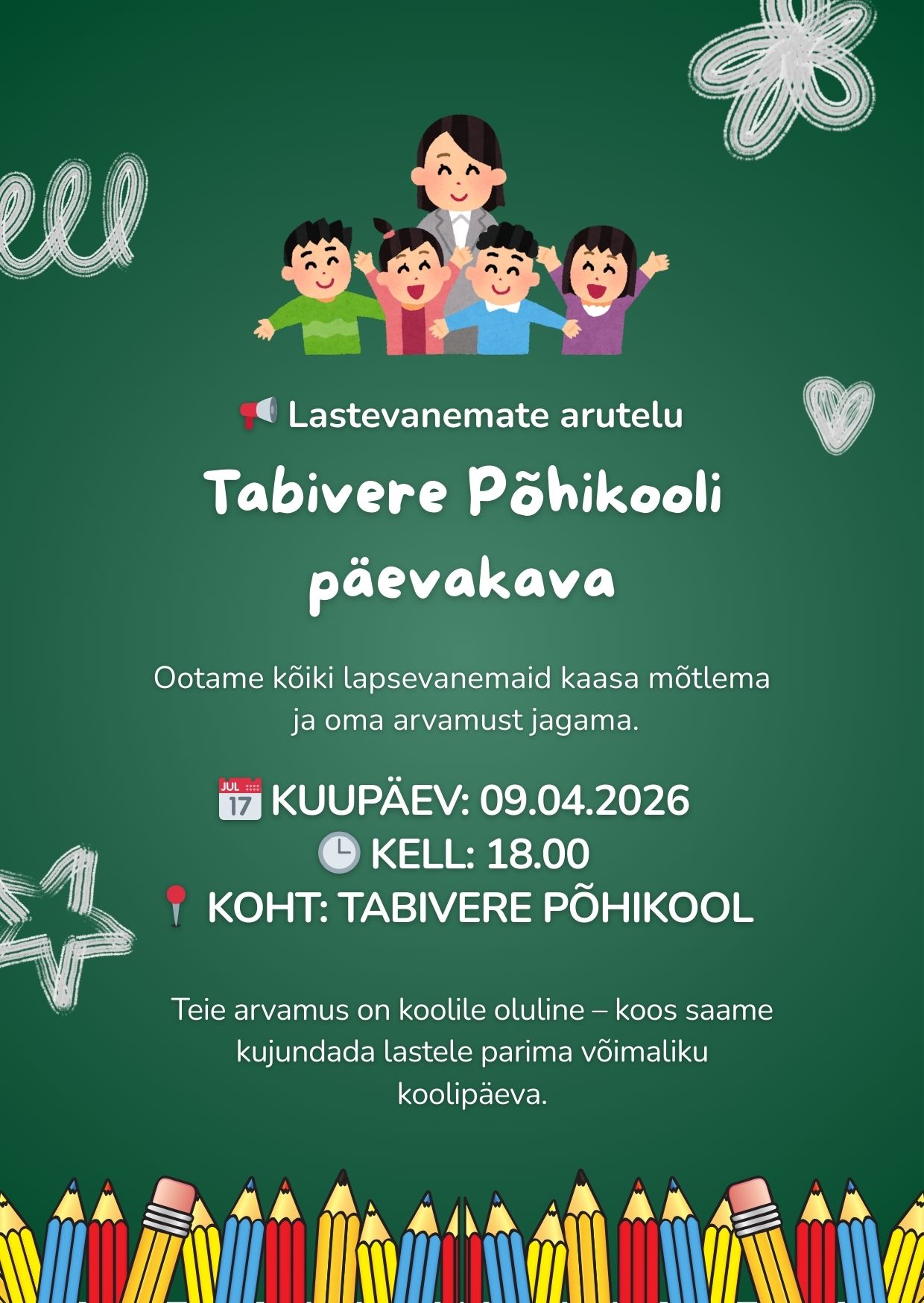 Ootame kõiki lapsevanemaid kaasa mõtlema ja oma arvamust avaldama kooli päevakava teemal! Ava foto Viimati muudetud 18.03.2026.