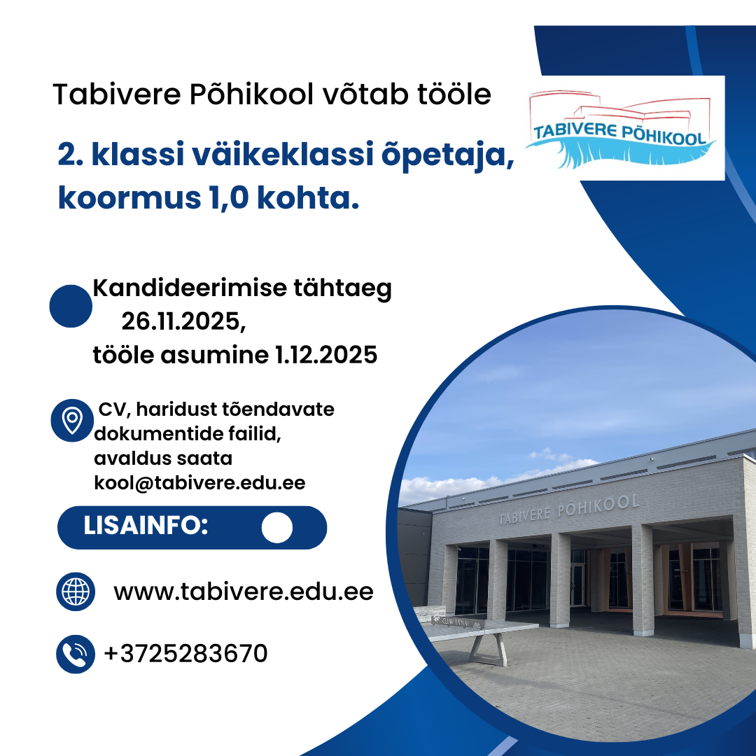 Otsime eripedagoogi! Loomise kuupäev 05.12.2025 Autor Kadi Kesa Jõulukampsuni päev 19. detsember Loomise kuupäev 05.12.2025 Autor Kadi Kesa Jõuluetendus 18. detsember kell 16 rahvamajas Loomise kuupäev 05.12.2025 Autor Kadi Kesa Jõululaat 15. detsember kell 8 Loomise kuupäev 05.12.2025 Autor Kadi Kesa Vaata rohkem